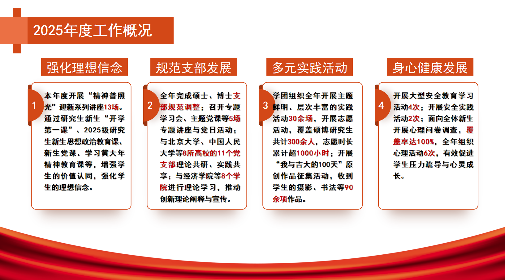 最后,红石榴社团主席王博涵进行工作汇报。本年度,社团顺利完成换届,重点推进内部融合与定位梳理,通过举办新成员见面会、民族联谊、篮球比赛等活动,初步奠定了组织发展的基础。新的一年,社团将重点围绕三方面展开工作:一是深化理论学习传播,通过沙龙、情景剧等形式推动马克思主义民族理论内化外化;二是打造“红石榴”特色品牌活动,结合校庆等重要节点开展融合性实践活动;三是加强内部建设,完善工作机制与培训体系,营造团队成长氛围。