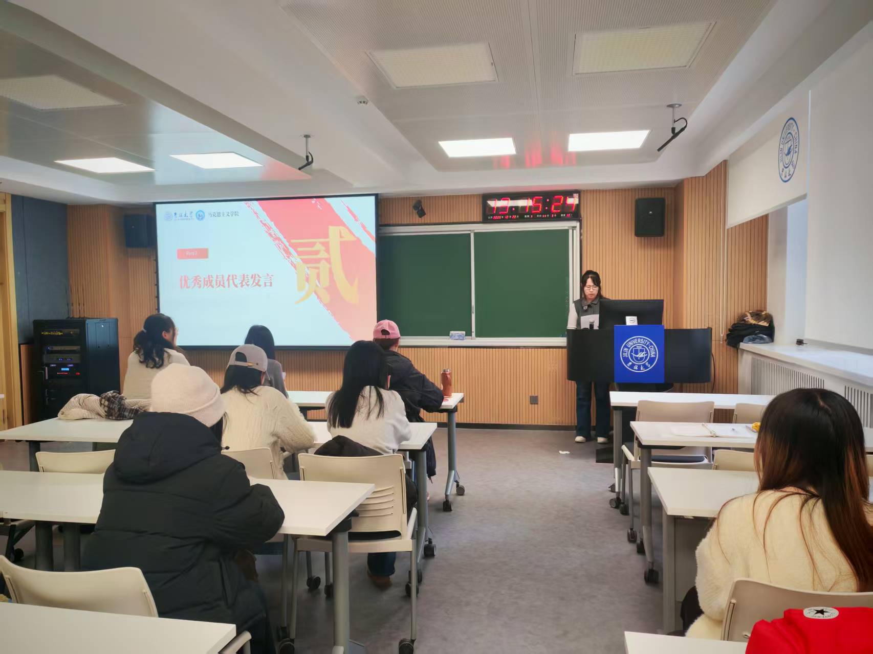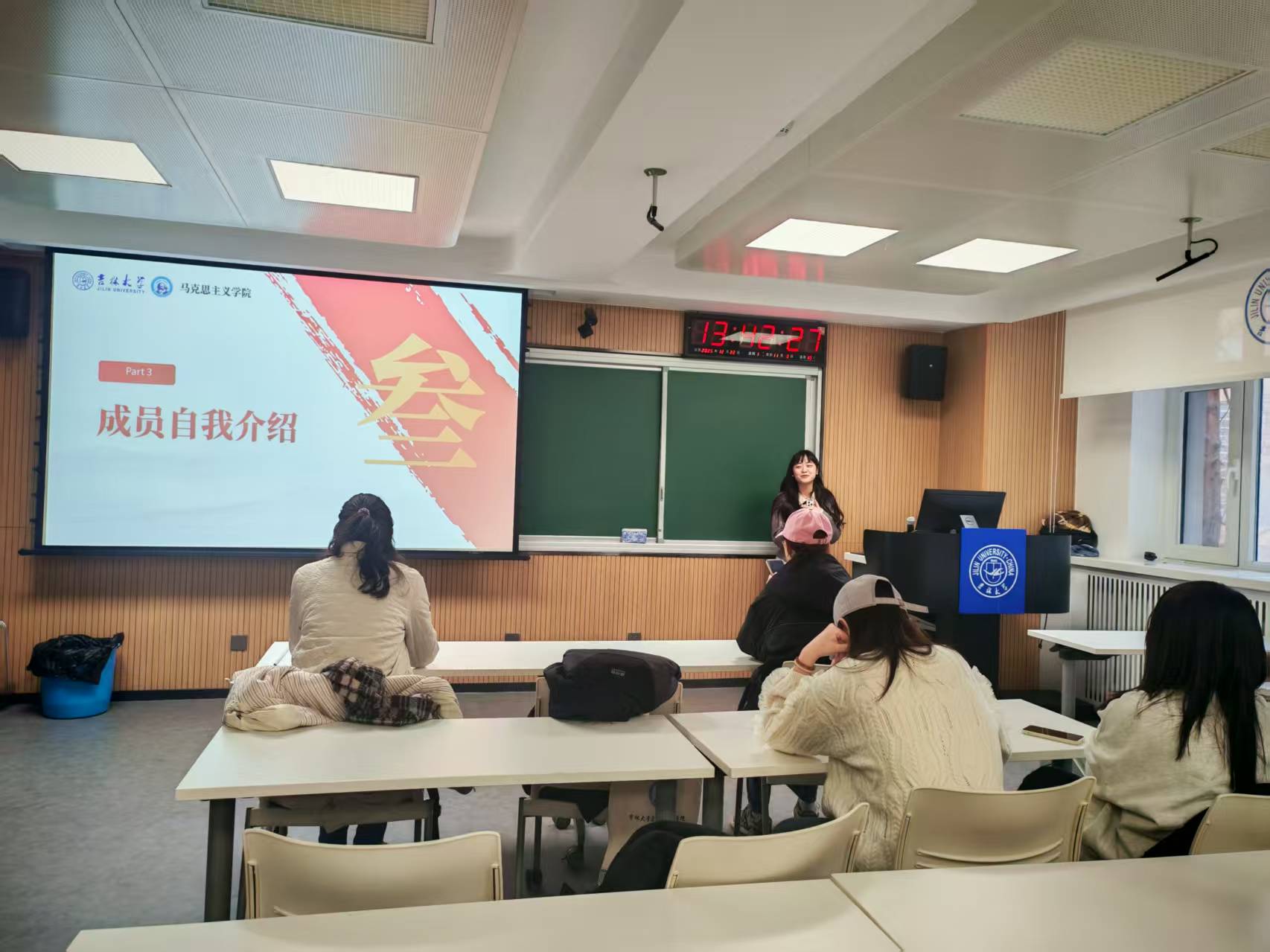 刘盈利同学对M·M学习研究会做基本介绍。围绕“什么是M·M理论学习研究”“为什么要进行M·M理论学习”“如何将M·M理论转化为实践”三大核心问题展开系统介绍。开展M·M理论学习,既是把握时代发展规律、增强“四个自信”的理论需求,也是马院学子筑牢信仰根基、践行青年使命的必然选择。在实践层面,负责人也为成员们明确方向:要依托马院学科优势与师资力量,夯实学术根基,提升研究专业性和前瞻性。