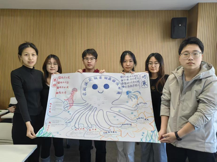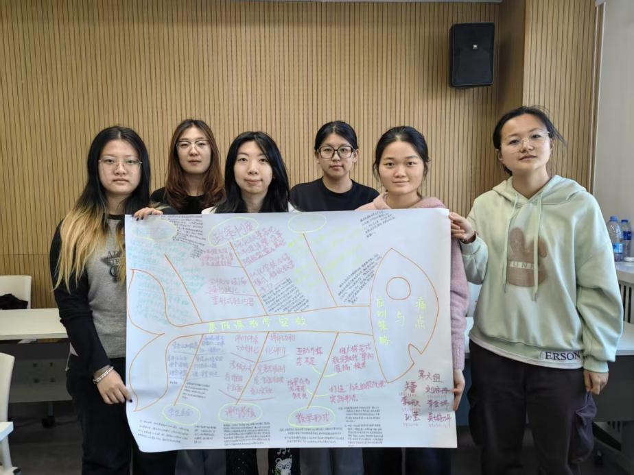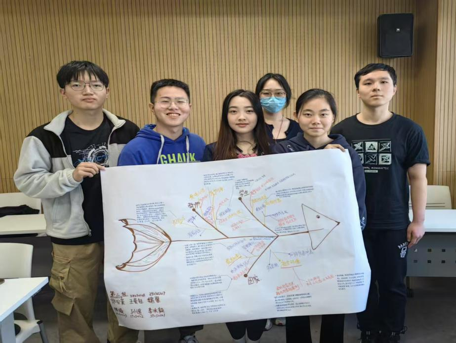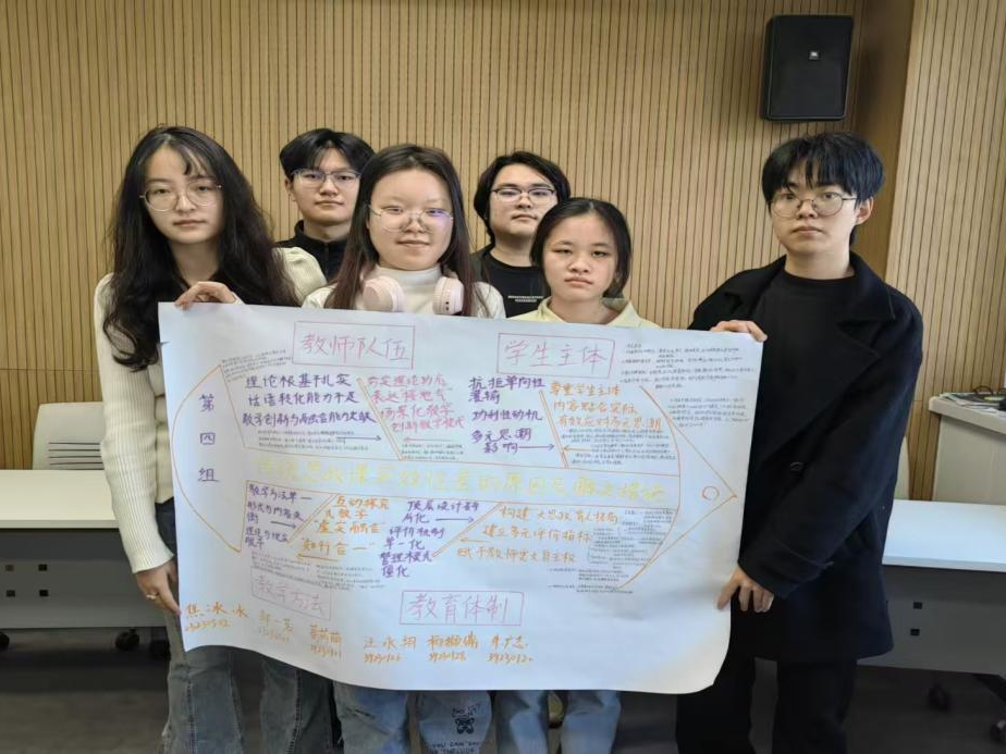 第六小组以鱼骨图为工具,将复杂问题拆解为教学内容、教学形式、评价体系、政策制度四大维度及教师、学生两大主体。刘亦冉同学率先提出“学生亲身经历与课堂灌输理念冲突”的核心痛点,为研讨奠定基础。李金瑞同学精准把控节奏,引导成员聚焦“教学内容”“教学形式”两大主干深化探讨;李如欣指出教学形式互动性不足的具体表现,关蕾分享评价体系形式化的现实问题,孙莹补充教学资源不足的痛点,吴婉坪总结提出通过政策制度保障赋能育人的核心对策。