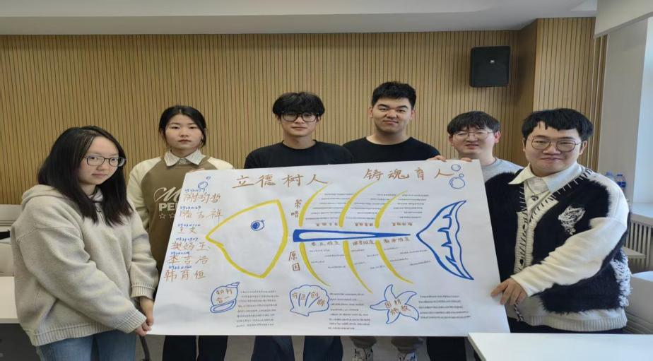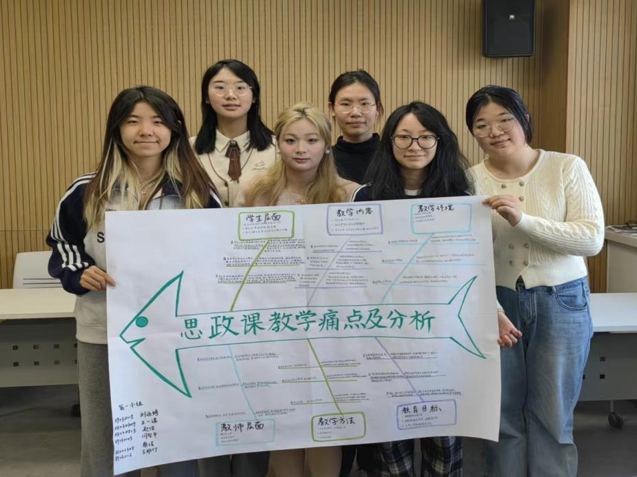 第四小组由组长邹一茗全程把控节奏,先拆解出教师队伍、学生主体、教学方法、教育体制四大分析维度,再引导成员逐维度深挖问题。焦冰冰、葛芮萌聚焦教师队伍理论转化能力不足、教学方法固化等核心问题;汪永翔、杨撷鼎梳理出学生功利性学习动机、评价机制单一化等痛点;朱广志负责整合观点,针对性提出“构建大思政育人格局”“赋予教师更大教学自主权”等解决措施。最终形成的鱼骨图清晰呈现问题的因果逻辑与改进路径,成果兼具系统性与实操性。