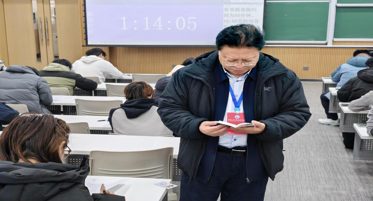 为严格落实学校期末考试管理要求,严明考试纪律、维护公平公正考试秩序,扎实推进学院学风院风建设,保障教育教学质量与人才培养核心成效,马克思主义学院于2025-2026学年第一学期期末考试期间,学院党委书记钟新、教学副院长李静、副院长姜鑫、党委副书记金光旭,中国特色社会主义理论体系研究中心行政副主任高月、教学办公室主任于敏、教学秘书张皓深入各考场一线,开展期末全校思政课和学院专业课考试巡考工作。重点巡视了,考场的考试组织、考场环境、考试秩序等情况,查看了考生证件携带、座位安排、考场纪律以及监考教师履职尽责状况。从巡考整体情况来看,本次期考场秩序井然,氛围良好,展现了我校学生严谨求实的学风和积极诚信的精神面貌。